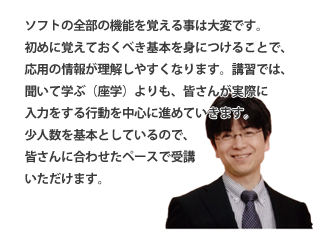 | ご注意事項 | 受講ソフトをインストールしたノートPCをご持参ください。プロテクトキーの貸出が可能です(PC・キーの貸出をご希望される場合は必ず事前にご連絡ください)。開始時間の10分前までにご来場ください。 | |