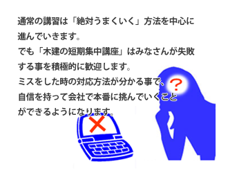 指導暦15年、現場出身講師の説明だから安心!!現場もパソコンも熟知した講師がパソコンの苦手な方にも丁重にお伝えします。建築用語の基礎知識も交えながら進めていく講習は初心者の方にも好評です。